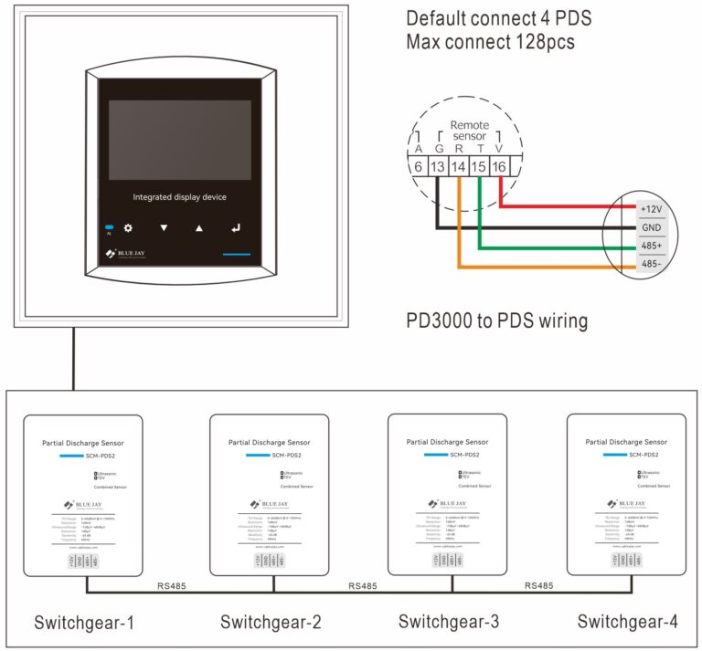 The basic feature of Blue Jay PD3000 online partial discharge monitoring is a long-life partial discharge sensor compatible with an external power supply and battery power, a panel-mounted HMI unit with automatic PD data acquisition and analysis, supporting up to 96pcs sensor, an RS 485 MODBUS-RTU for easily integrated SCADA systems, and easy installation.