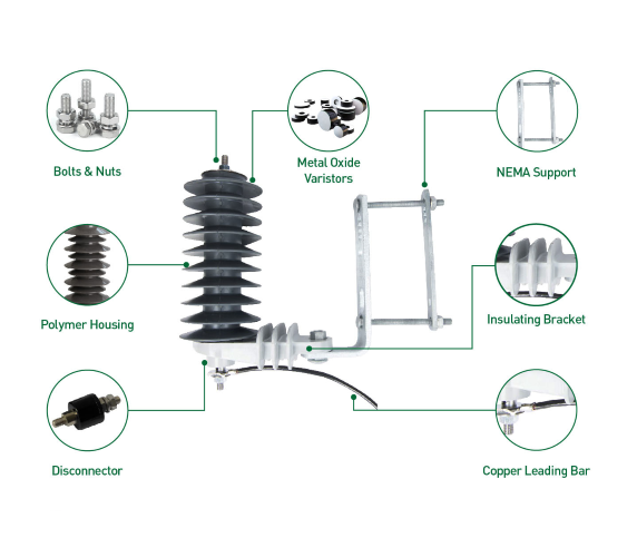 Semi Knock Down Solution for Surge Arrester, including metal oxide varistors, polymer housing, disconnector, copper leading bar, insulating bracket, NEMA support, etc.